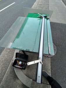 割れてしまったガラスを取り外したのち、作業車内で新しいガラスを現場で正確に切断します。